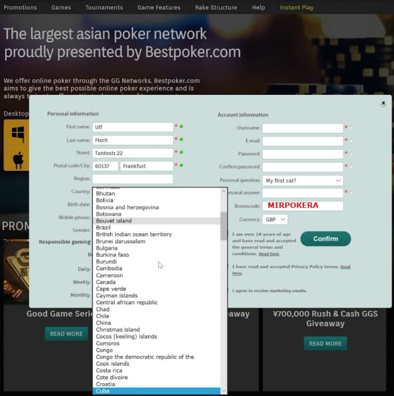- Шаг 2. Зарегистрировать игровой профиль, перейдя на официальный сайт Бест Покер по нашей ссылке (бонус код не тредуется). Игроку, вошедшему на сайт под новым именем и паролем, сразу предложат придумать для себя уникальный ник. Новичок же после проведения первого депозита становится обладателем соответствующего бонуса.