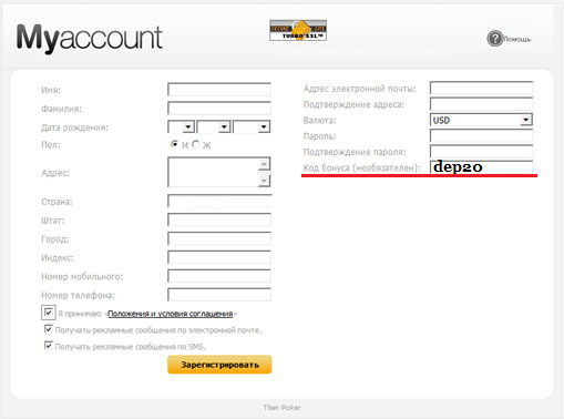 После заполнения всех полей нажмите кнопку “Зарегистрировать”. На экране будет показан ваш ID в Титан Покер, вида TTR123456789 Обязательно запишите его, так как это ваш основной идентификатор в покерруме.