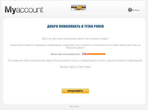 Поздравляем, вы успешно прошли регистрацию и можете начинать свою покерную карьеру! Вам остается лишь сообщить свой номер счета вида TTR123456789 в службу поддержки Мира Покера (нажать красную надпись "Задать вопрос").