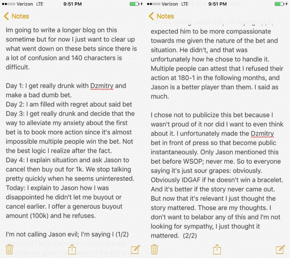Ладно там Дмитрий, у которого на счету пока что действительно нет ни единого браслета. Но ставить против самого Джейсона Мерсье, который на наш взгляд является одним из самых сильных покеристов современности. Ведь как ни крути, а за свою профессиональную карьеру (не считая этот WSOP) 29-летний американец целых 16 раз выходил за финальные столы Мировой Серии и трижды становился победителем. Как минимум необдуманное решение сделала Ванесса… хотя оно и не удивительно – нужная доза алкоголя ей хорошенько помогла в его принятии. Возвращаясь к теме пари, то новый коэффициент против Мерсье составил 180:1 ($1 800 000 к $10 000). Да уж, тут и Билзерян с Перкинсом отдыхают! Кстати, своим поступкам Селбст таки нашла оправдание… ну или почти. Текст оригинала: