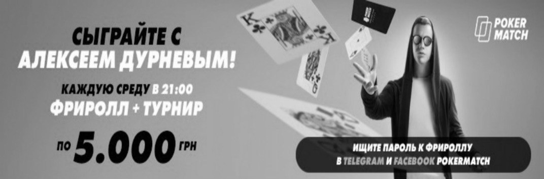 - Фриролл с Алексеем Дурневым с гарантией 5 000 грн. Стартует каждую среду в 21:00 по киевскому времени. Все фриролл пароли от Покер Матч на него также нужно искать в социальных сетях Facebook и Telegram – они публикуются на официальных страничках в 18:00. Примечательно, что если вы обыграете самого Алексея, который зарегистрирован в комнате под ником “durnev”, за это вы гарантированно получите еще 500 грн. сверху. Регистрация проходит через лобби: