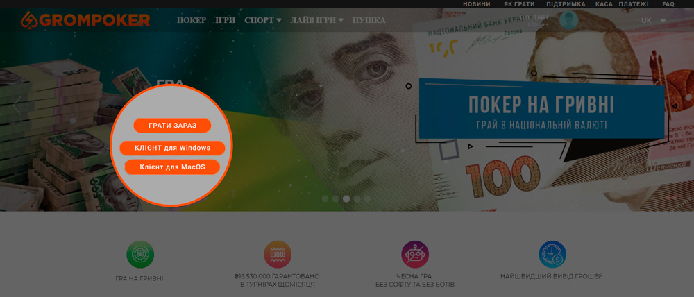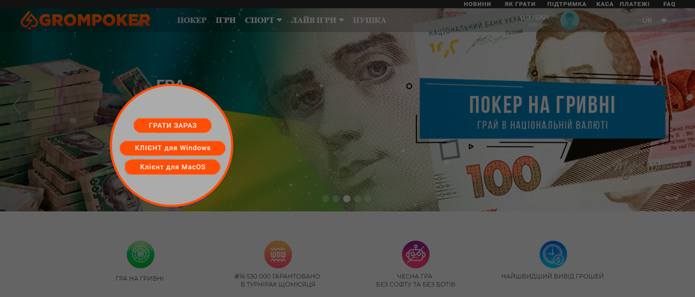 Комната Grom Poker специализируется на предоставлении услуг в Украине, соответственно все игры здесь ведутся на гривны. Интерфейс же представлен не только на украинском, но и на русском языке – вот какие разделы ждут вас:
