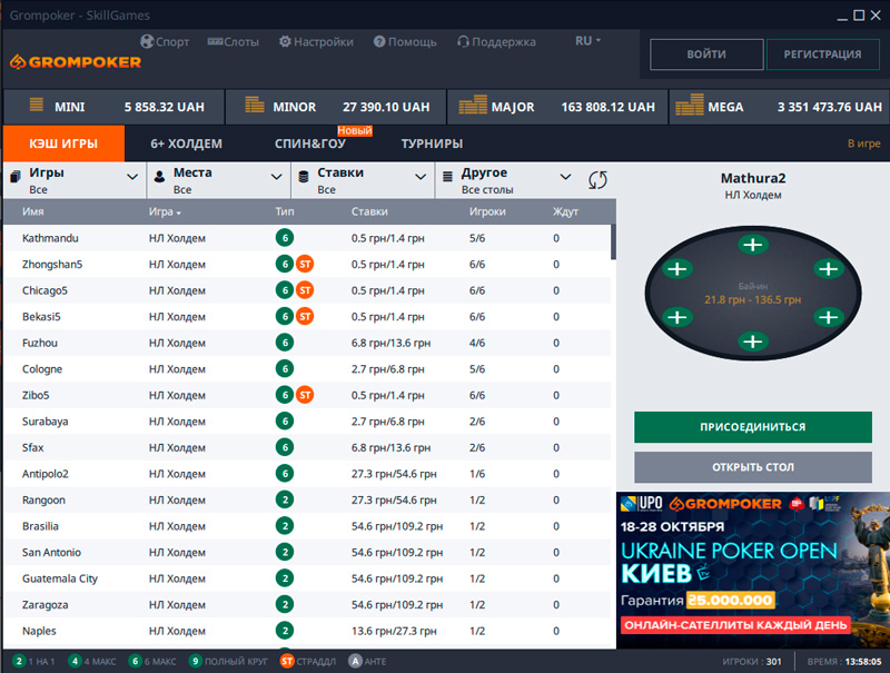 Уже в отдельных вкладках можно перейти к меню онлайн казино или спортивных ставок. Говоря конкретно о покере, то непосредственно в клиенте вас ждет достойный выбор кэш-игр и турниров как по Холдему (в том числе 6+), так и Омахе. GromPoker преимущественно ориентирован на рекреационных игроков, поэтому средний размер блайнда здесь варьируется от 0,20 до 100 гривен. Также в лобби находятся фризаут турниры, ивенты с повторным входом, нокаут-турниры, сателлиты и т.д. При этом для игроков всегда доступны бесплатные турниры с солидными денежными гарантиями.