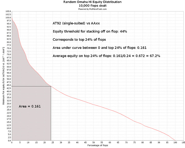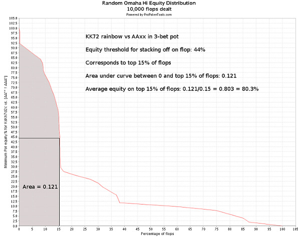 Ниже мы рассмотрим распределение флоп-эквити и вычисления EV для коллирования 3-бета с КК72 и АТ92 против ААхх. Заметьте, что в ProPokerTools, при указании руки оппонента, мы используем «АА** ! ААА*». Это исключает руки типа АААх, которые оппонент бы, скорее всего, не 3-бетил.
