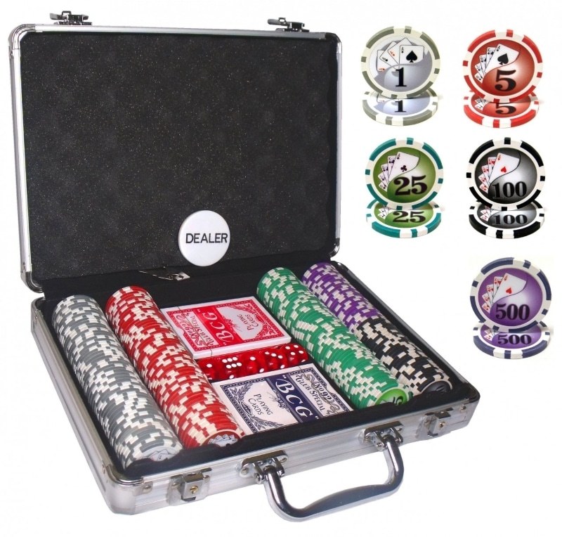 В набор входят: Алюминиевый кейс, ключи от кейса, кнопка дилера, 5 игральных костей, 2 колоды карт с пластиковым покрытием (54карты) и фишки 8 номиналов.