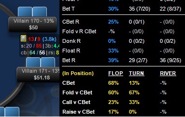 Прочитав заголовок, вы, наверное, задались вопросом, о чем пойдет речь в этой публикации. Так что же означает несоответствие покерной статистики? Все очень просто – это разница между определенными показателями, которая при достаточном понимании является довольно-таки полезным знанием. Стандартные отличия между VPIP и PFR или даже foldVflopCB и foldVturnCB играют важную роль при построении +EV розыгрышей. Дабы лучше понять суть данного утверждения, разберем пример на основе картинки ниже, в частности статистику игрока «Villian 170» – процент случаев в которых он использует продолженную ставку в позиции на флопе и терне (In Position – Cbet FLOP/Cbet TURN).
