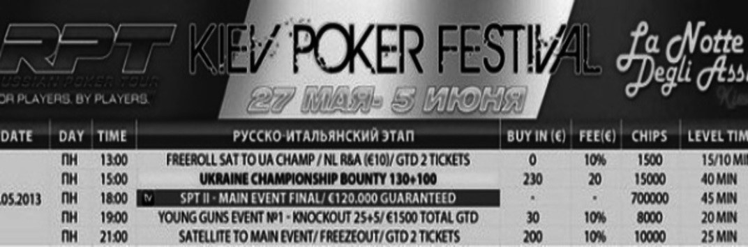 Ожидается, что первый этап Russian Poker Tour, RPT Kiev Poker Festival, пройдет в Киеве с 27 мая по 5 июня 2013 года. На этот раз он состоится при участии итальянской серии под названием La Notte degli Assi. Директором RPT Kiev Poker Festival является Эрик Шахбазян. В то же время руководителем Гранд Финала, как и в прошлом году, станет итальянец Рафаэль Мария Ди Никола, известный своим опытом в области организации покерных турниров.