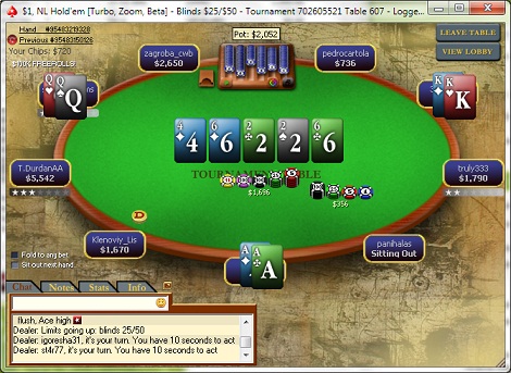 «Придется сбросить, но ведь так хотелось посмотреть, что у него!», – стандартная фраза любителей сверхбыстрого покера. Участвуя в турнире типа Zoom можно посмотреть раздачи, в которых вы решили не принимать участие! Полная информация о розыгрыше появляется в окне истории рук сразу после ее окончания. Учтите, что построение этого списка идет в зависимости от начала раздачи, а не ее окончания.