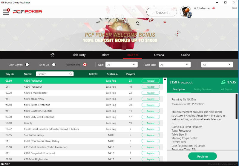 PCF Poker – один из немногих румов сети Microgaming дающий доступ к ее пулу игрокам из России. Комната отлично подходит для тех, кто ищет слабый экшн на низких и средних лимитах вместе с высоким кешбеком и регулярными промо акциями. Репутация и скорость кэшаутов здесь на высоте. Также следует отметить, что поля здесь весьма слабые из-за особенностей софта – на PCF разрешено использовать только часть вспомогательных программ.