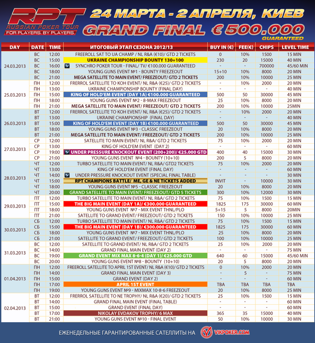 Главное событие RPT Grand Final с бай-ином в €2,000 имеет гарантированный призовой фонд в €300,000. Огромное количество сателлитов сделает его действительно доступным для каждого. -