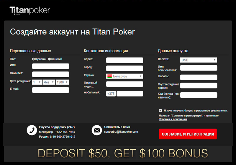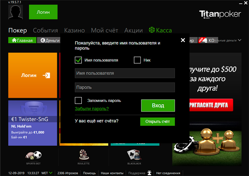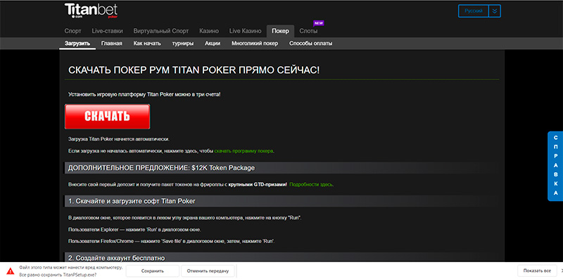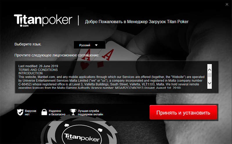 Установка. Программа установки приступит инсталляции клиента. Она предложит выбрать язык. Также вам необходимо будет принять лицензионное соглашение и что вам уже есть 18 лет. По окончании установки войдите в игровой клиент посредством иконки Titan Poker на вашем рабочем столе.